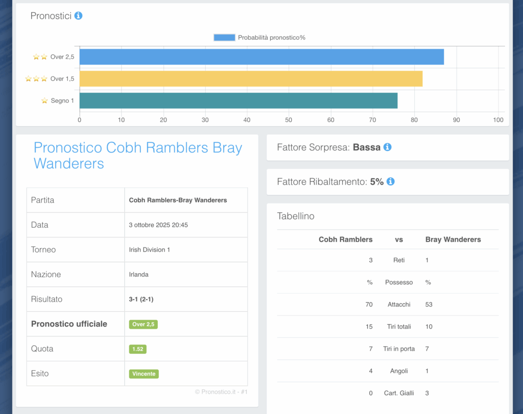 - Pronostico Principale (Blu): Over 2,5 a 1.52, 2 stelle e 87% di probabilità