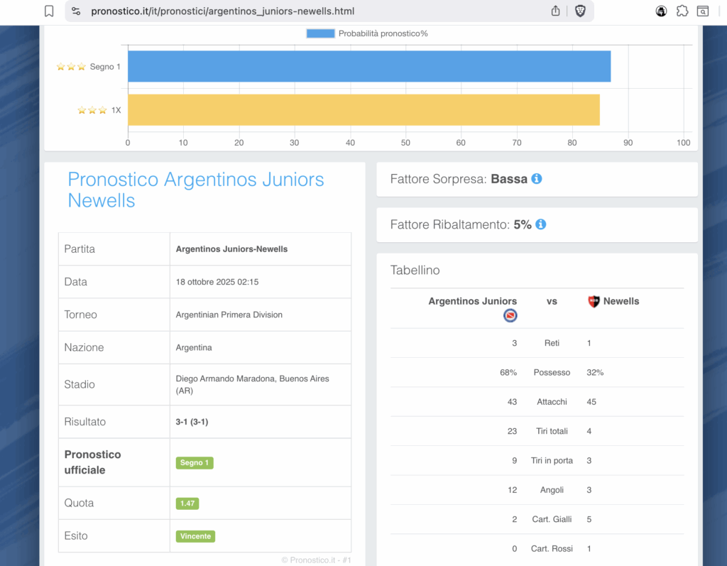 - Pronostico Principale (Blu): Segno 1 a quota 1.47, con 3 stelle e 87% di probabilità