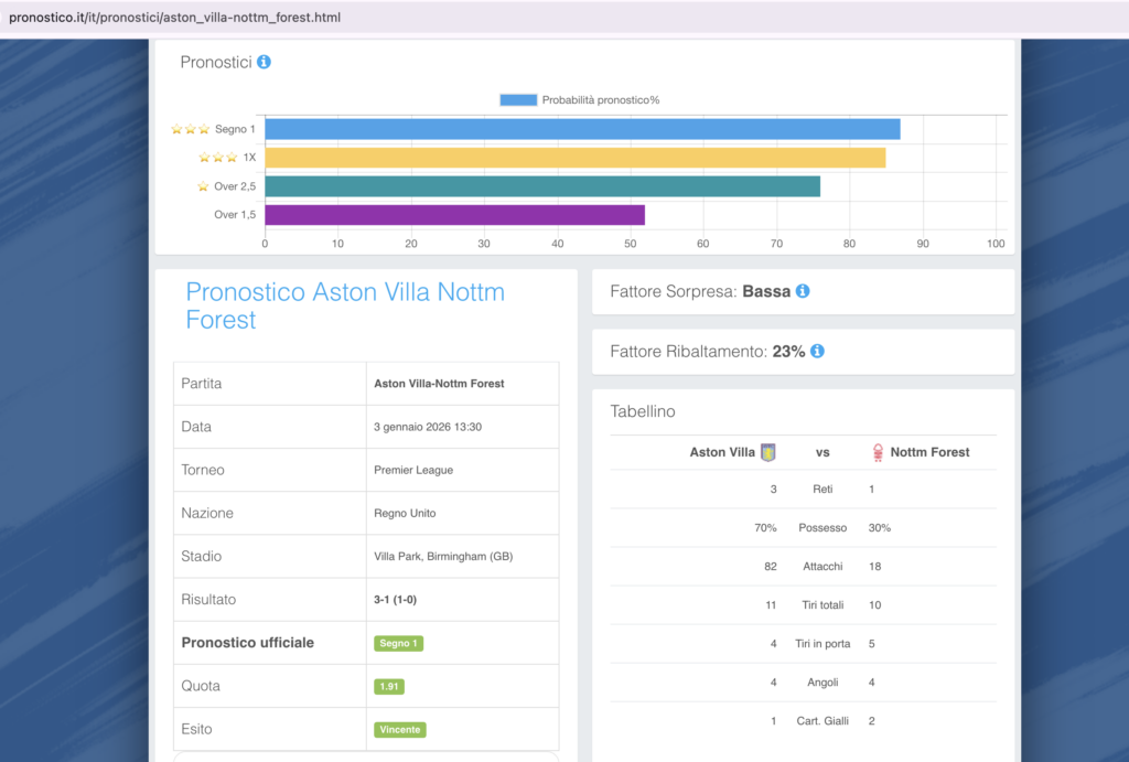- Pronostico Principale (Blu): Segno 1 a quota 1.91 con 3 stelle e 87% di probabilità