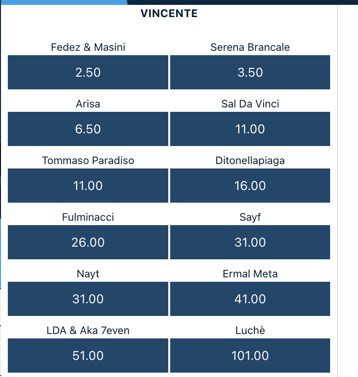 Colgo l’occasione per fare un aggiornamento sul Festival di Sanremo: Fedez & Masini sono scesi a 2.50 mentre Serena Brancale è rimasta a 3.50. La sensazione è sempre più che la lotta sia a due. Da segnalare comunque la scesa della quota di Arisa a 6.50.