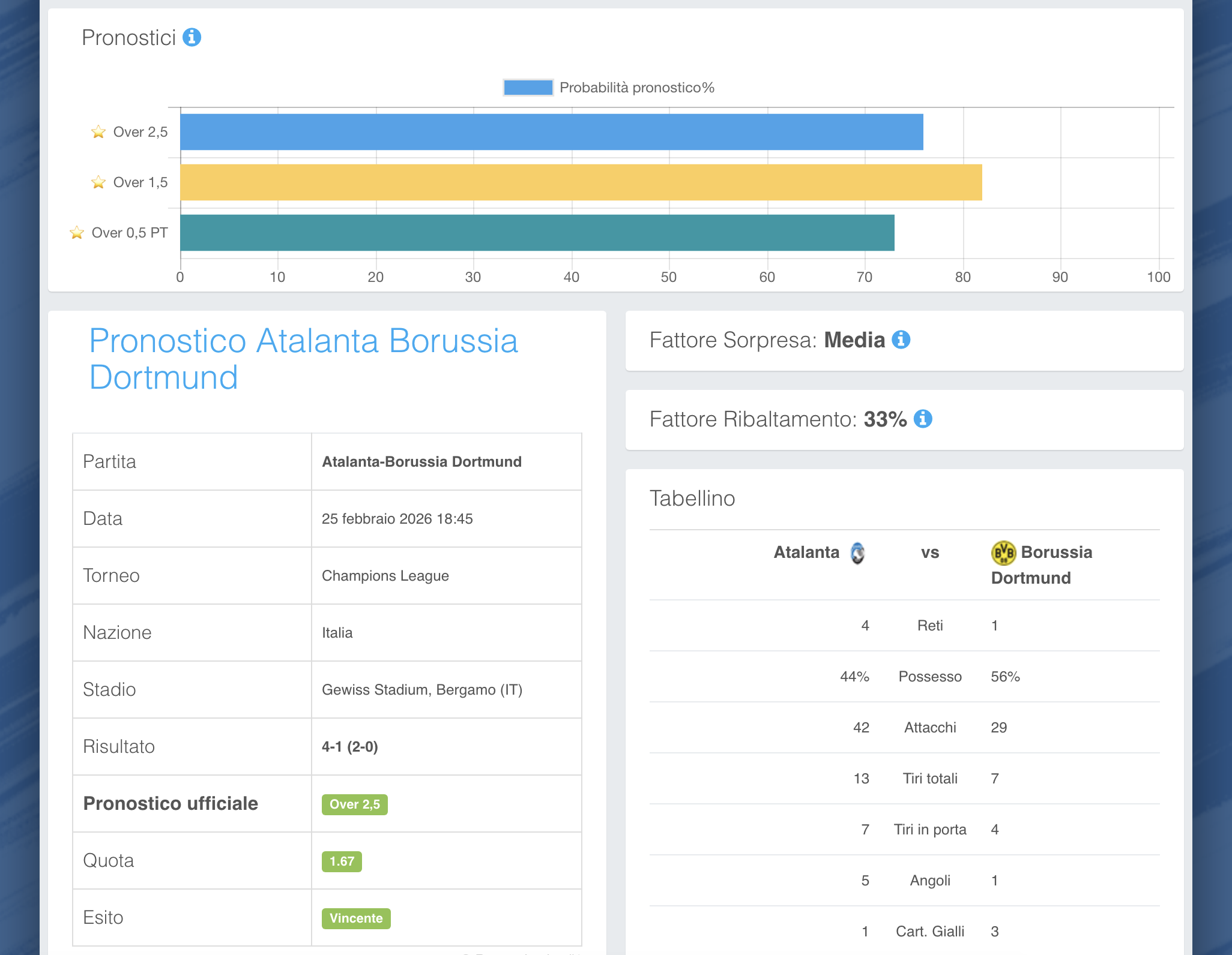 - Pronostico Principale (blu): Over 2,5 a quota 1.67, una stella, 76%