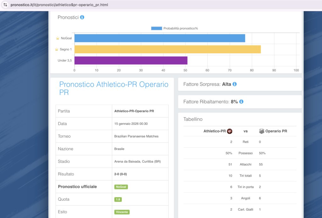 - Pronostico Principale (Blu): NoGoal a quota 1.80, una stella, 77%