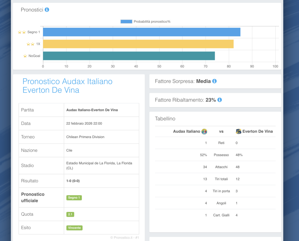 - Pronostico Principale: segno 1 con due stelle a quota 2.10 con probabilità 85%