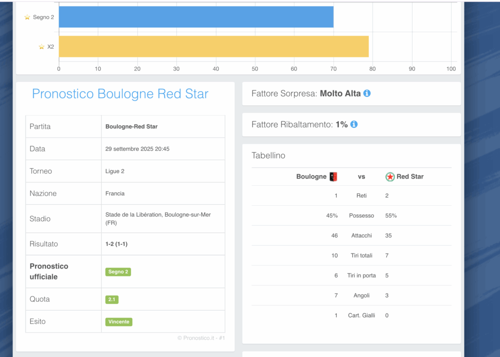 - Pronostico Ufficiale (BLU): Segno 2 a quota 2.10 con una stella e 70%