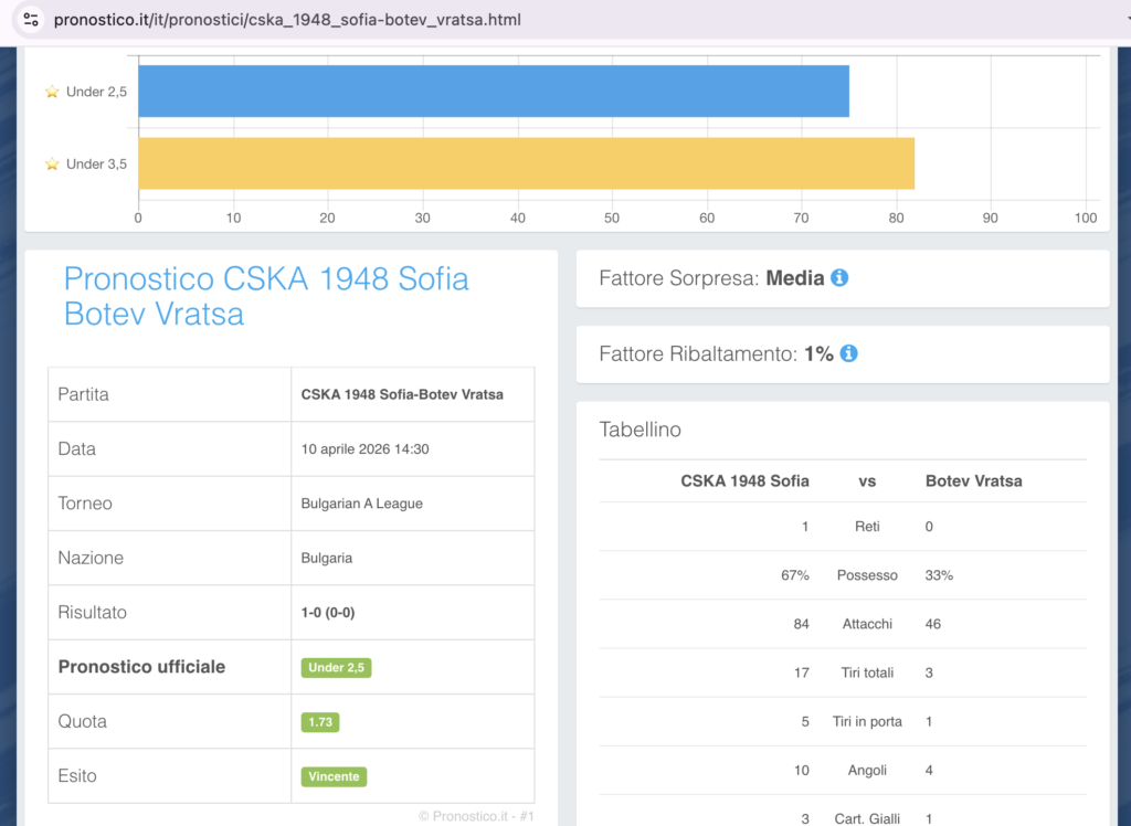 Analisi Pronostico CSKA 1948 Sofia – Botev Vratsa: Under 2,5 a 1.73