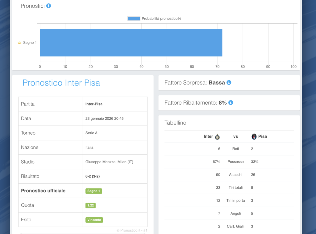 Sto parlando di Inter-Pisa, anche se Pronostico.it PREMIUM ha fornito il segno 1, a livello di Metodo QSC non mi piaceva. In realtà i più attenti avranno notato che lo stesso Pronostico.it aveva poca convinzione: un unico pronostico, “secco”, segno 1 e con percentuale bassa per essere un pronostico principale: solo 72%.