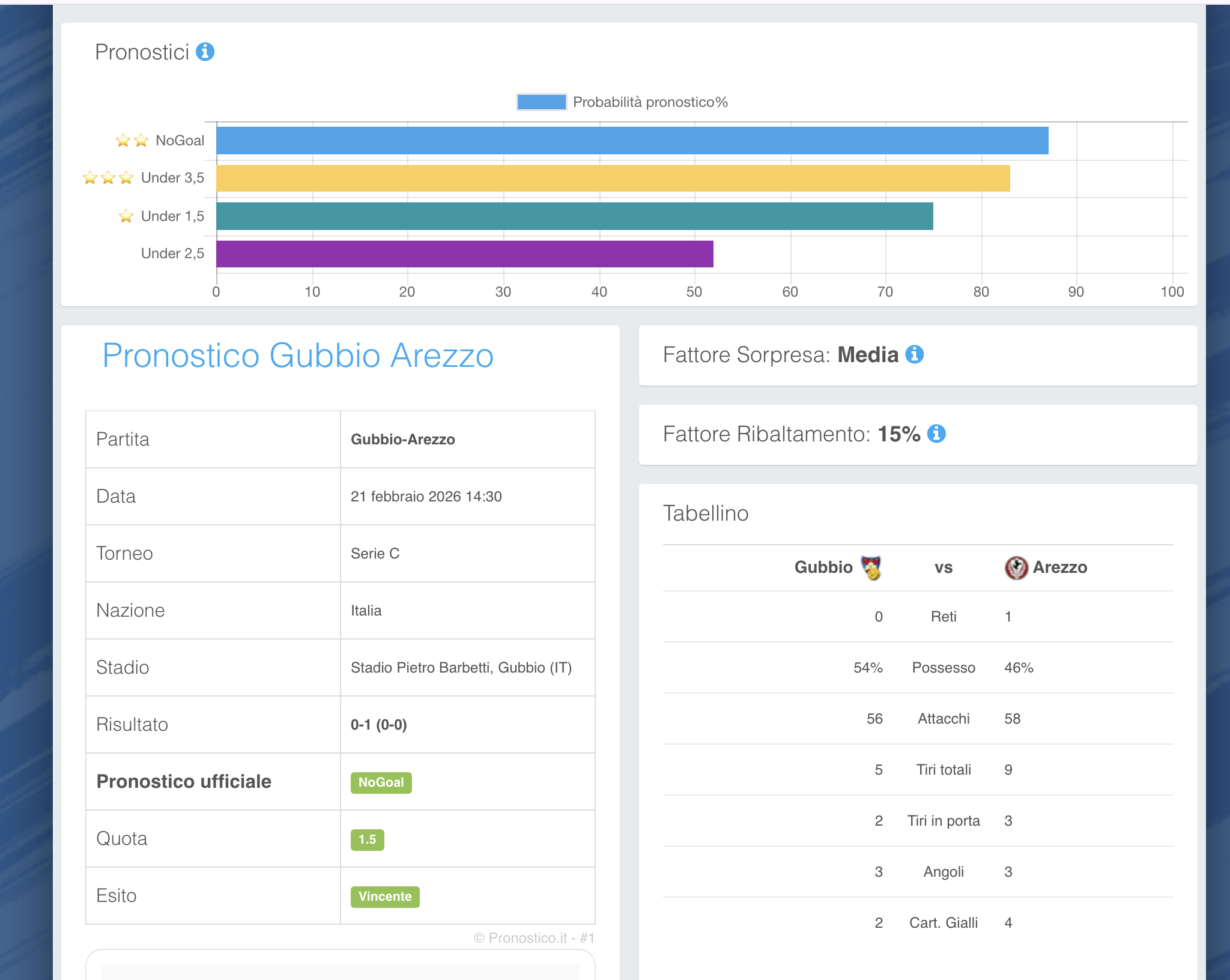 Mi è andato l’occhio su questa partita di Serie C, Gubbio-Arezzo, dove ci sono stati 4 pronostici vincenti tra cui un Under 1,5 a 2.40 che è un’altra nuova chicca di Pronostico.it PREMIUM.