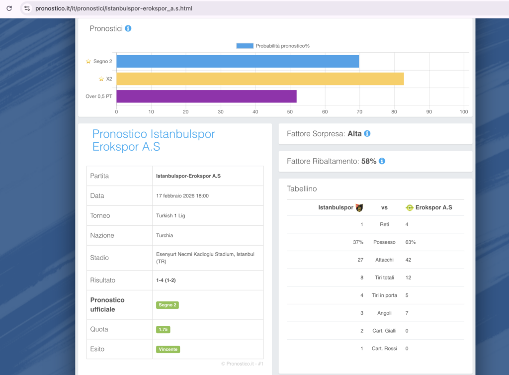 L’incontro è Istanbulspor-Erokspor A.S e Pronostico.it ha fornito 3 pronostici vincenti: