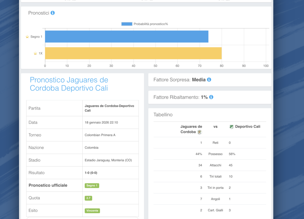 - Pronostico Principale (BLU): Segno 1 a quota 2.70, una stella, 74% di probabilità