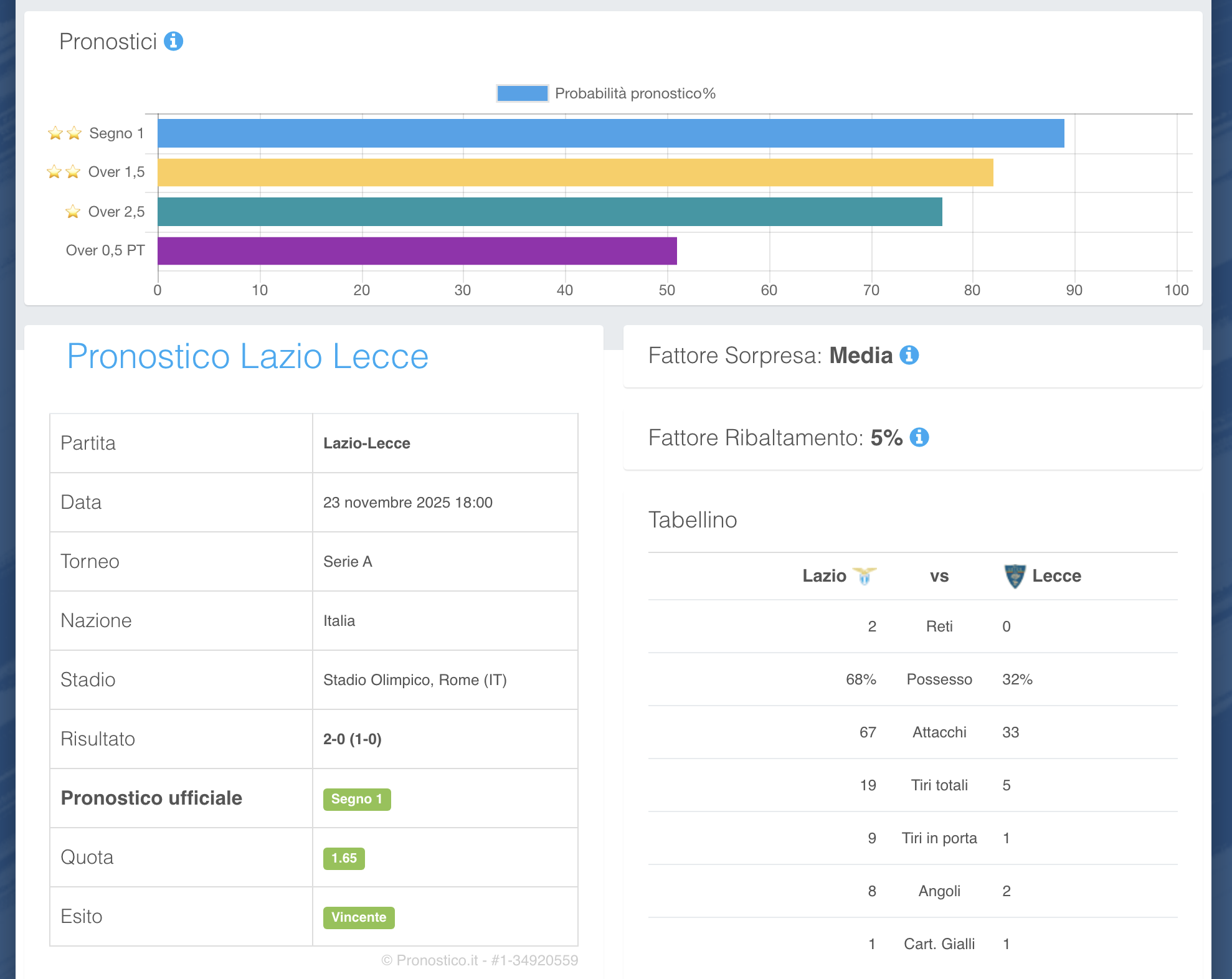 Pronostico.it PREMIUM ha fornito su Lazio-Lecce questi pronostici:
