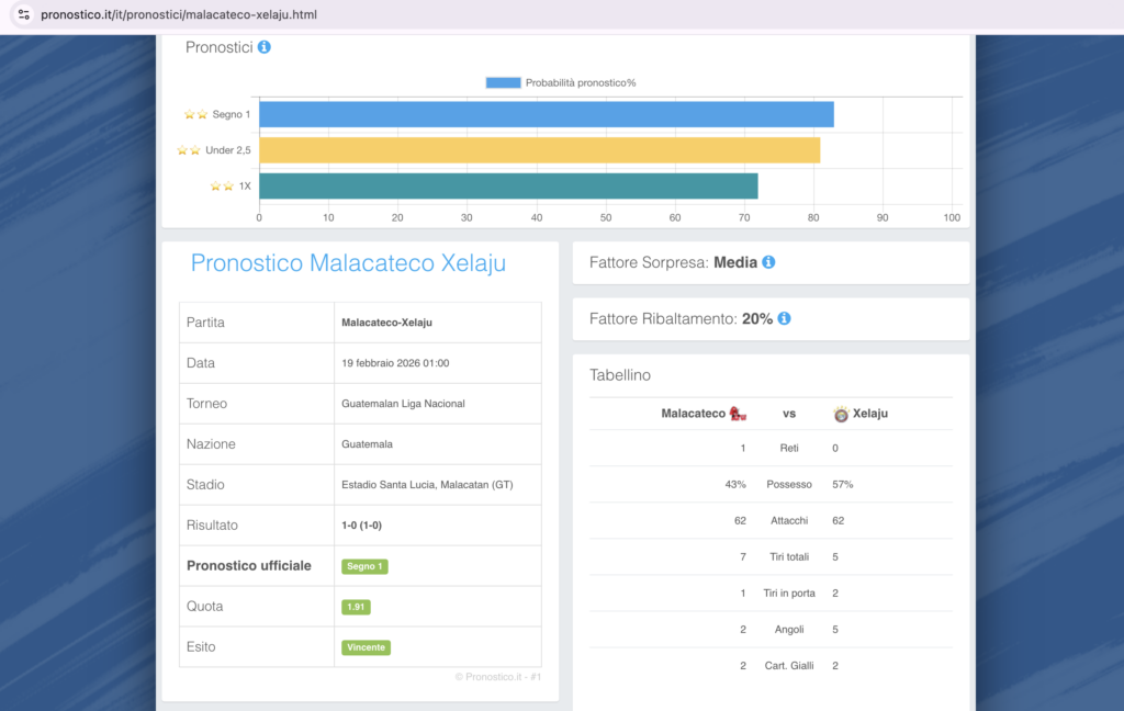 - Pronostico Principale (Blu): 1 a quota 1.91, due stelle, 83% di probabilità