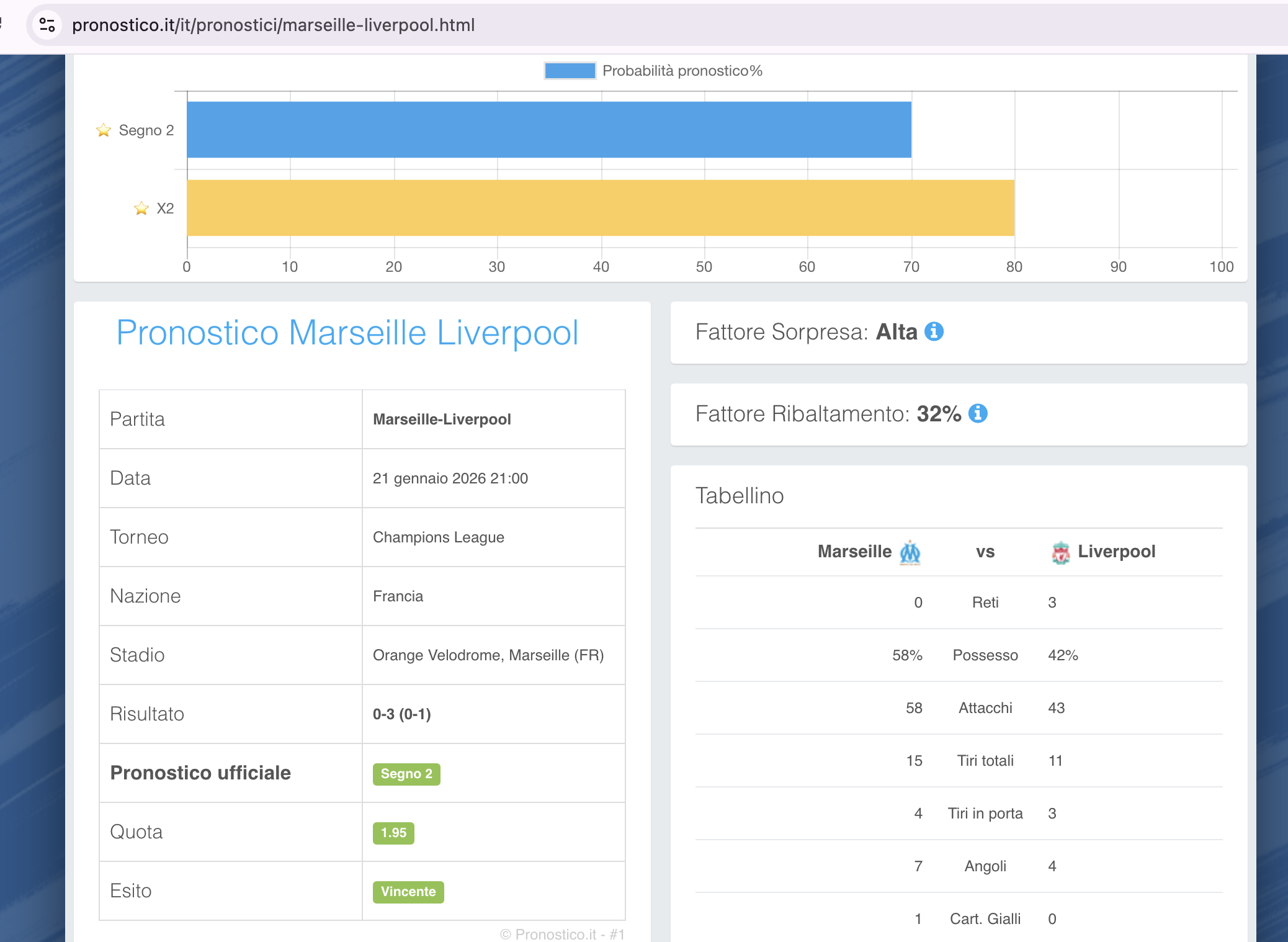 Care amiche e cari amici del Popolo QSC, oggi parliamo di Champions League. Analizziamo l’incontro Marsiglia-Liverpool, queste sono stati i pronostici forniti da Pronostico.it nella sua versione PREMIUM: