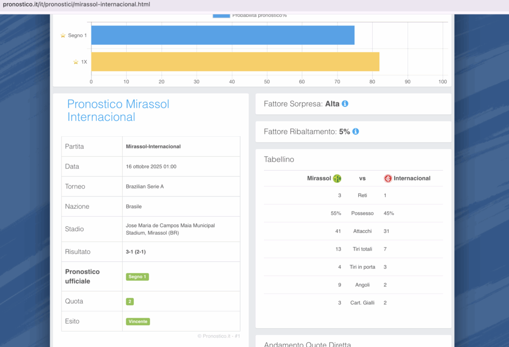 - Pronostico Principale: Segno 1 a quota 2.00, una stella, 75% di probabilità