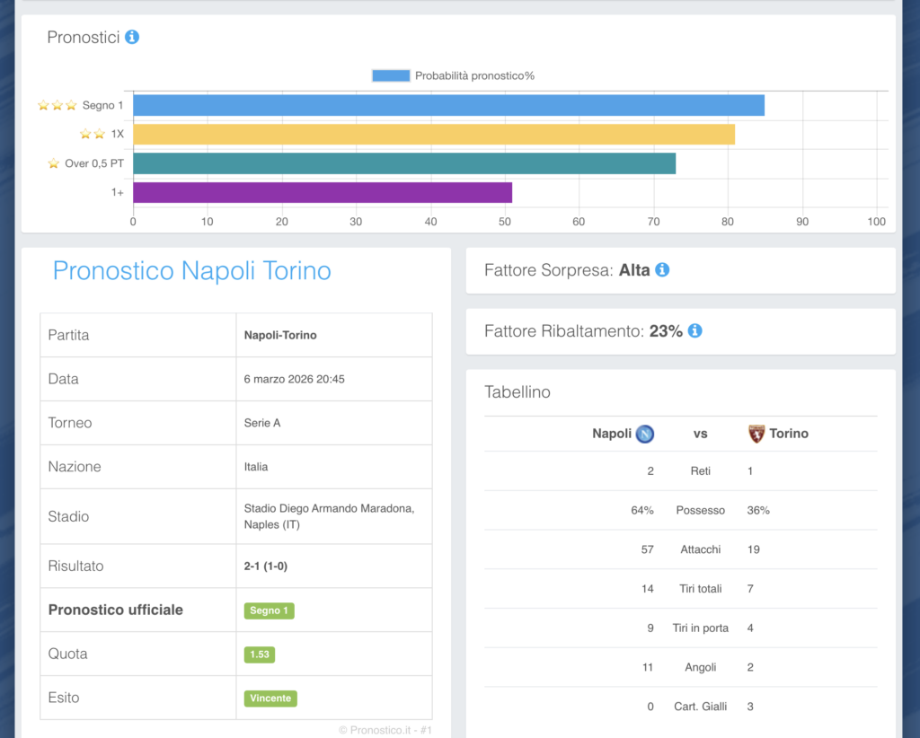 - Pronostico Principale: 1 a quota 1.53, 3 stelle, 85%