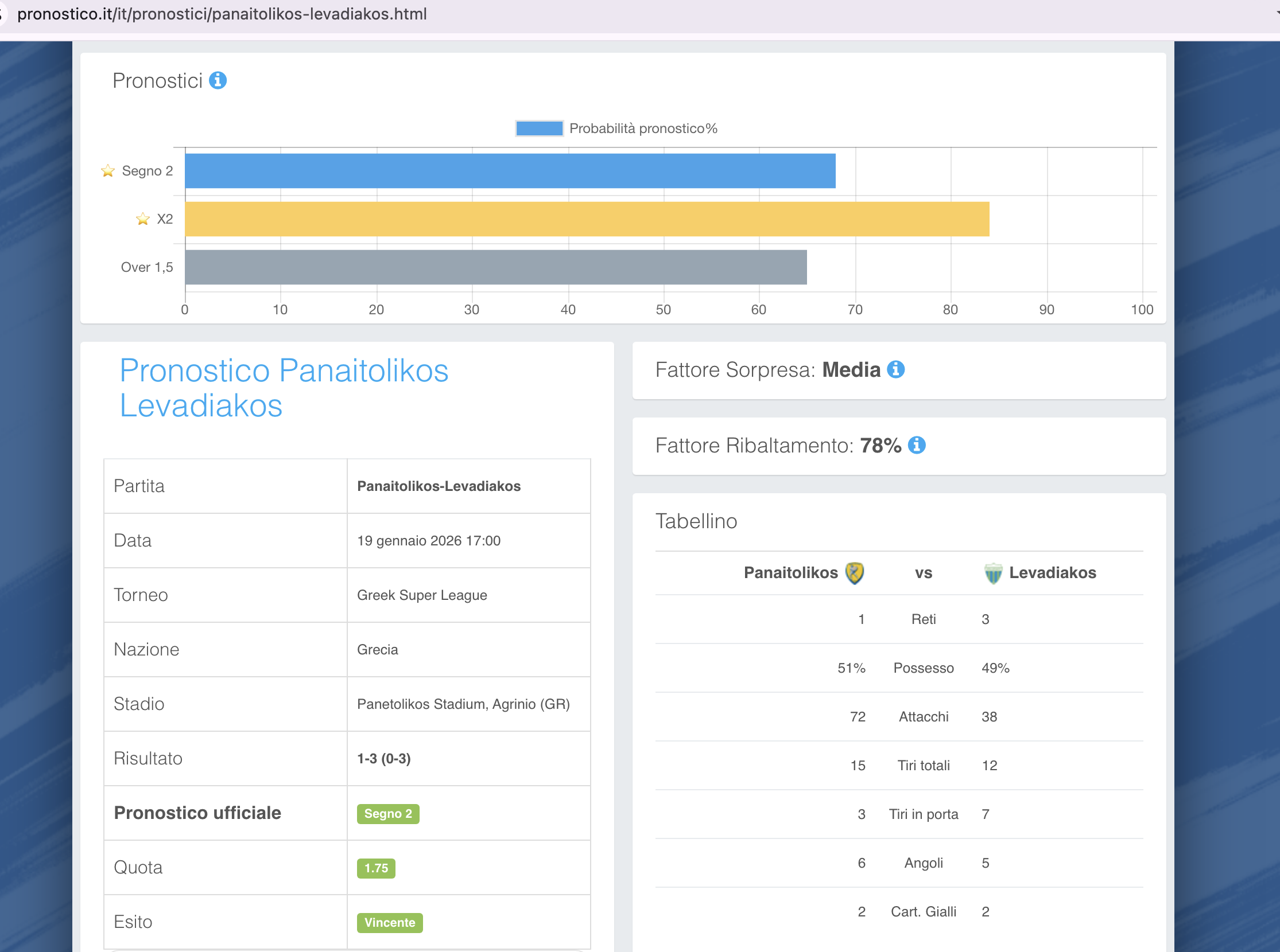 Pronostico.it, nella sua versione PREMIUM ha fornito 3 pronostici, tutti vincenti:
