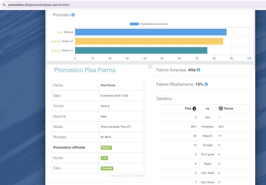 Care amiche e cari amici del Popolo QSC, oggi analizziamo l’incontro di Serie A Pisa-Parma su cui Pronostico.it PREMIUM ha fornito come pronostico ufficiale NoGoal.