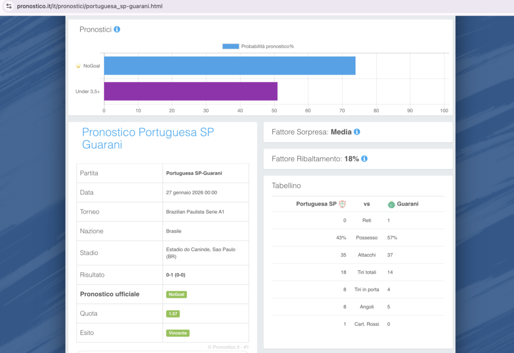 Il NoGoal infatti aveva tutti gli indicatori compatibili, ivi compreso quell’under 3,5 dato come pronostico lampo che lo facilitava. Pertanto, 1 non era da scartare a priori, ma c’era un pronostico migliore, più compatibile a livello di metodo QSC che corrispondeva anche con quello fornito da Pronostico.it PREMIUM.