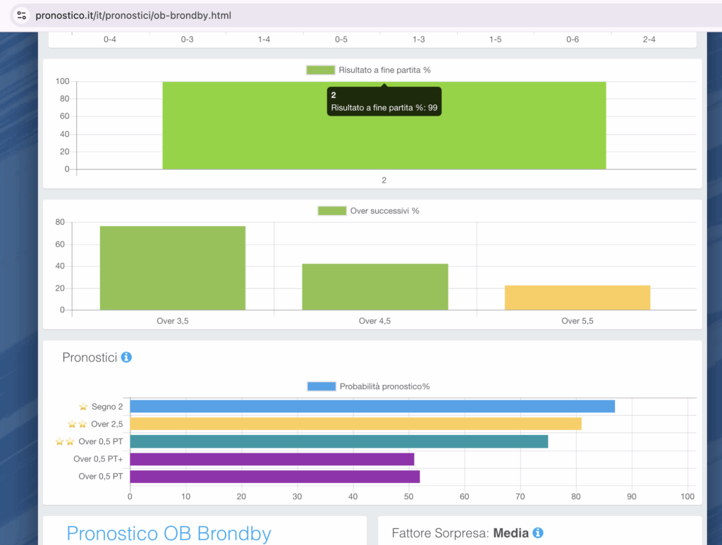 - Pronostico Principale (Blu): Segno 2 a quota 1.85 con una stella e 87% di probabilità