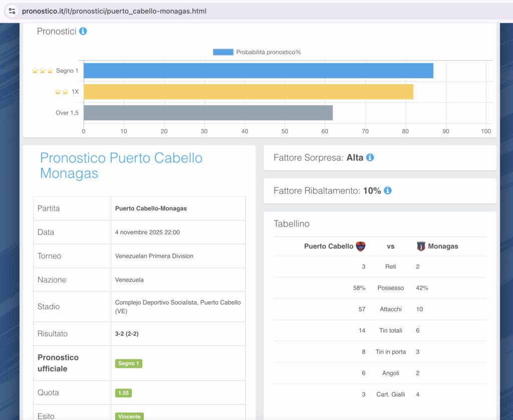 - Pronostico Principale (Blu): Segno 1 a quota 1.55, con 3 stelle e 87% di probabilità