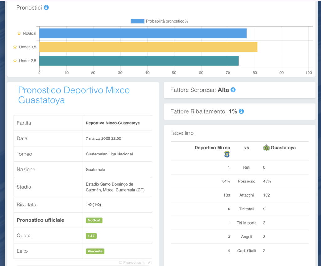 - Pronostico Principale (blu): NoGoal a quota 1.57, una stella, 77% di probabilità