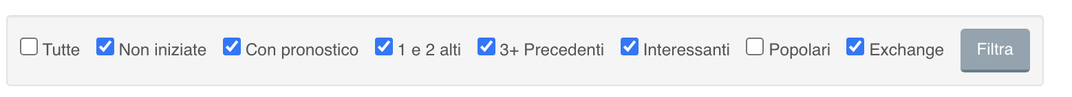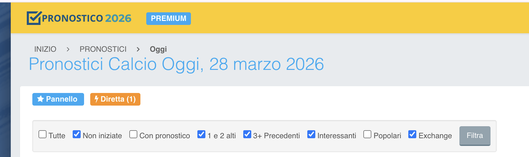 Inserire i filtri per aiutarsi a scegliere le partite da giocare, ad esempio io in questo caso ho scelto “Non iniziate” cioè partite che si devono ancora giocare, 1 e 2 alti aiuta a selezionare partite potenzialmente più in linea con il metodo QSC, 3+ Precedenti significa che ci sono almeno 3 recenti precedenti storici tra le due squadre, Interessanti è utile quando ci sono palinsesti molto grandi per scegliere partite che potenzialmente hanno alcune situazioni tipo studiate nel libro Quote Scommesse Calcio, Exchange lo consiglio a tutti coloro che utilizzano le piattaforme Exchange.