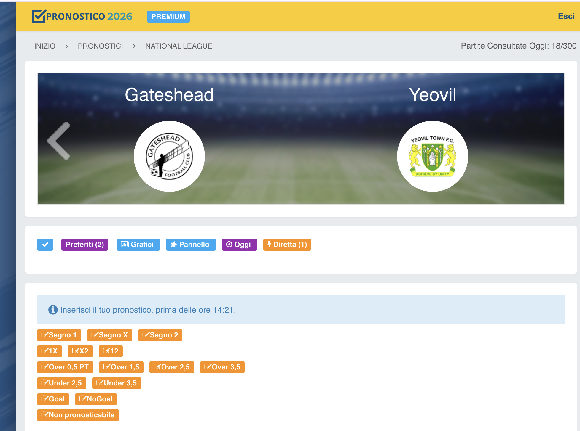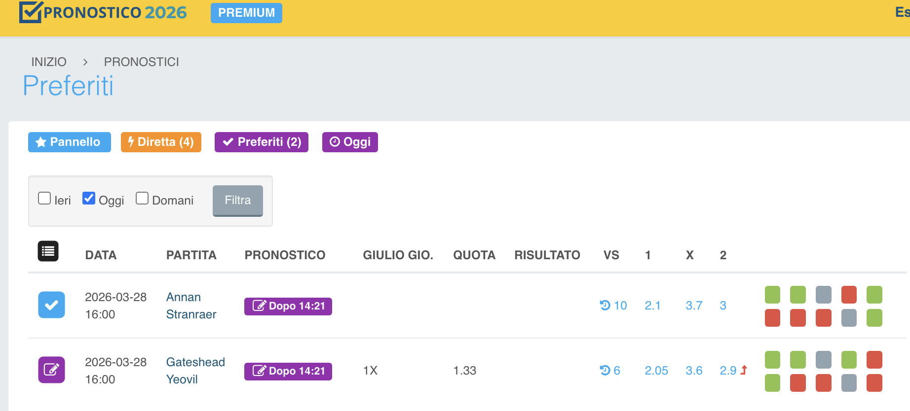 Possiamo vedere il riepilogo giornaliero dei nostri pronostici e del pronostico ufficiale per quell’incontro andando di nuovo su Preferiti. Avremo questa situazione: