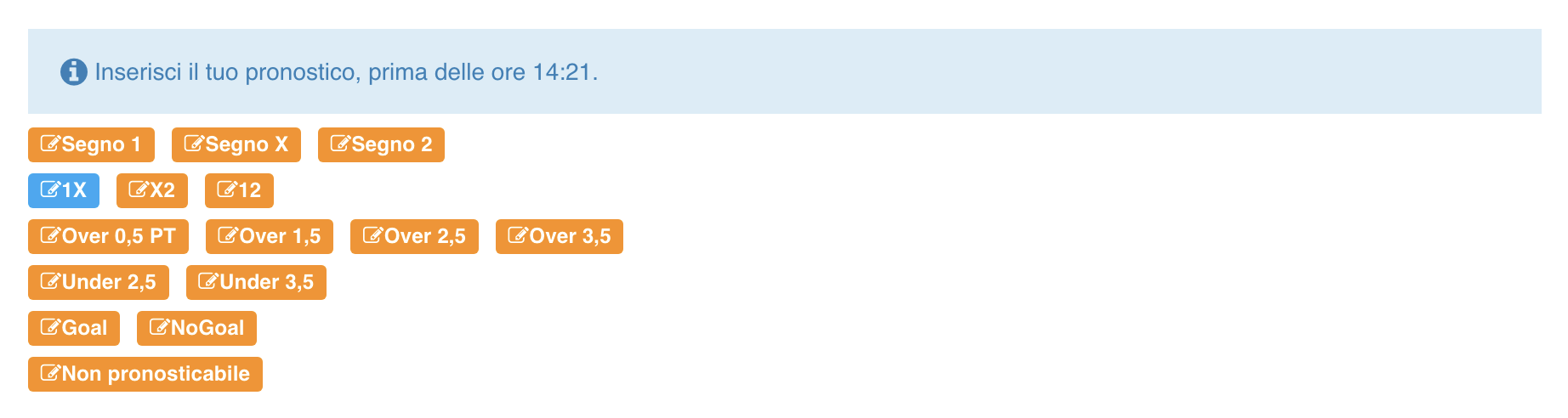 Ora vediamo come inserire un pronostico. Il primo consiglio è “leggete!” sullo schermo c’è scritto tutto, ma vedo che spesso in un mondo che va sempre di fretta i nuovi utenti sono distratti. Qual è la prima cosa che leggiamo “Inserisci il tuo pronostico, prima delle ore 14:21”. La partita si gioca alle 16:00 e alle 14:21 uscirà il pronostico principale, quindi l’utente può inserirlo fino ad un minuto prima.