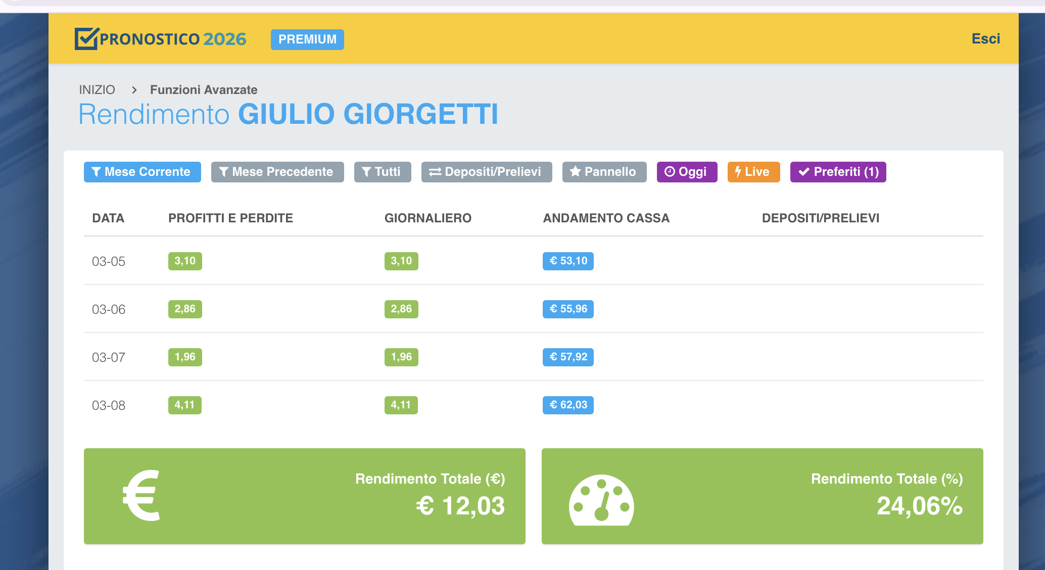Ora passiamo dal Pannello (Pronostici) al Rendimento (Gestione della Cassa).
