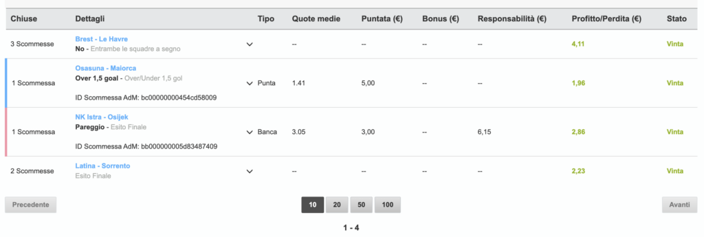 Ecco un esempio di utilizzo. Qui vedete che ci sono 4 pronostici. Mi sono collegato a Pronostico.it poche ore prima degli incontri, ho preso una fascia di partite che si sarebbero giocate nelle prossime ore e ho piazzato il pronostico.
