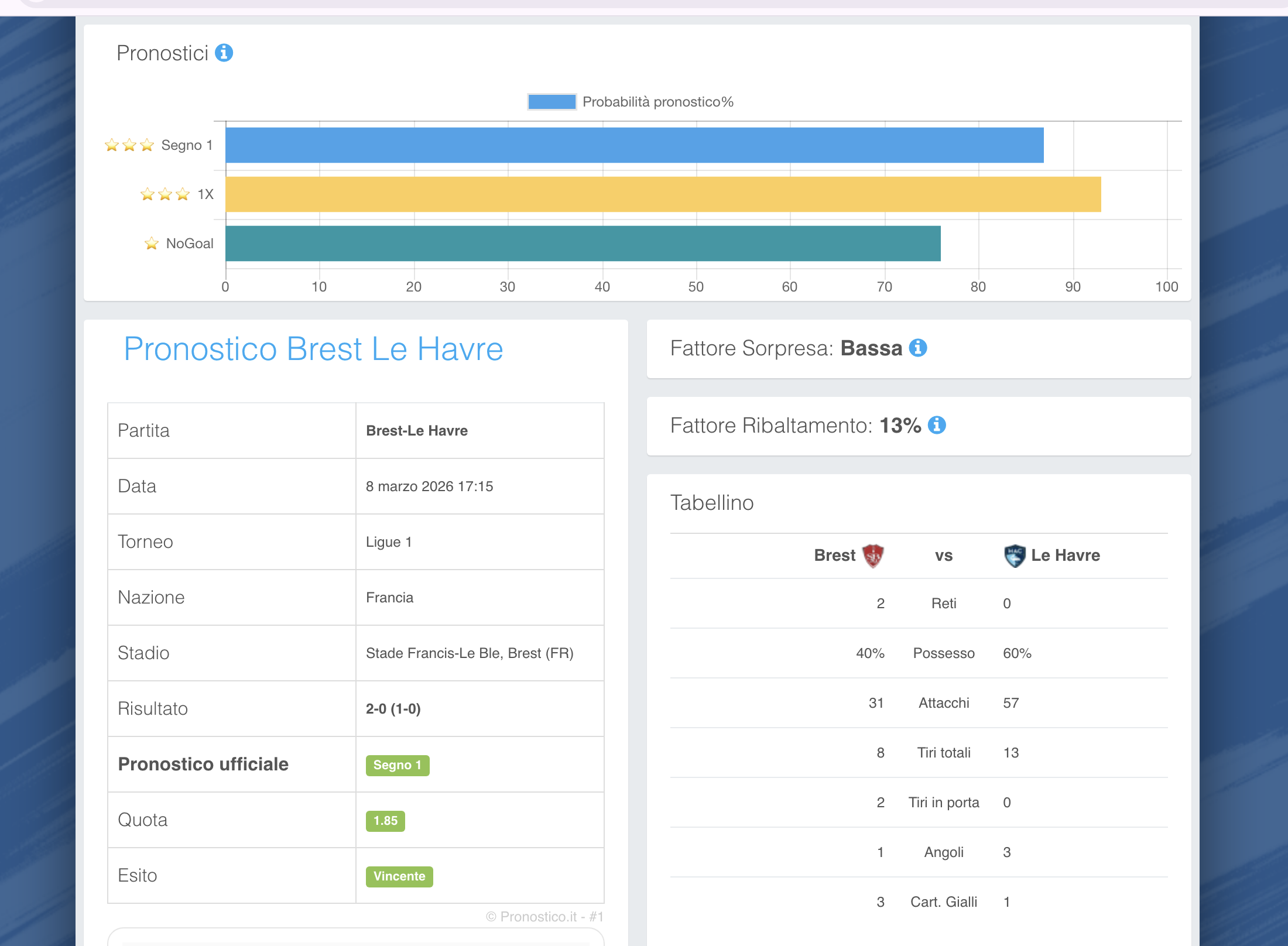 Qui ad esempio si può vedere che il mio NoGoal era confermato anche dal pronostico lampo.