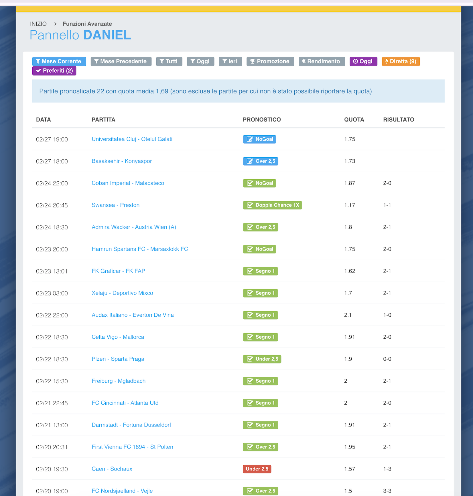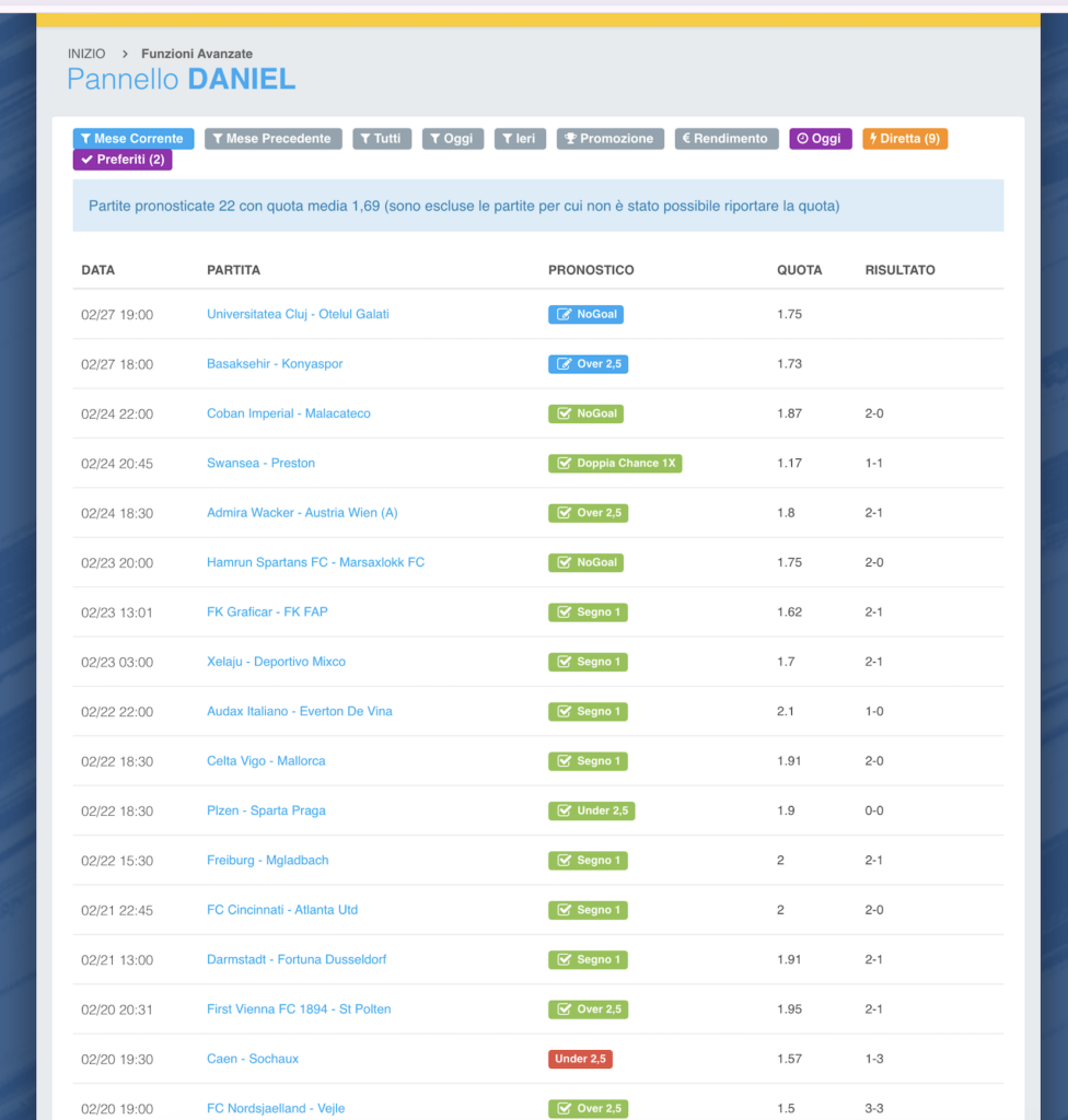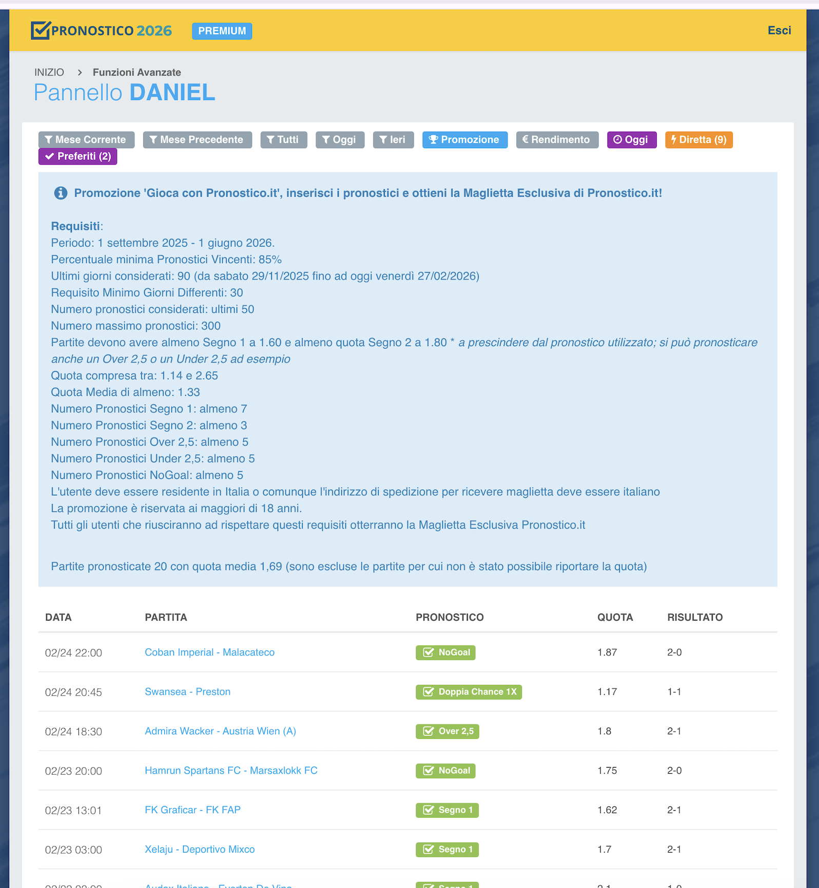Daniel ha selezionato esclusivamente partite compatibili con la promozione: il 100% dei pronostici presenti nel pannello compare anche nella sezione Promozione.