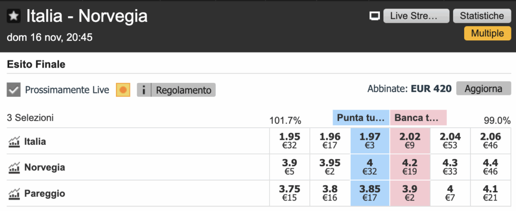 La sostanza non cambia su Italia-Norvegia di domenica 16 novembre, perché gli azzurri sono dati come favoriti a 1.80. Ma sulla base di cosa? Questa è una quota completamente sbagliata. Capisco che l’Italia deve vincere e da sportivo e tifoso voglio sognare la vittoria con 9 reti di scarto, che mi costa? Ma da scommettitore esperto questa è un’altra trappola! Basta analizzare l’incontro applicando il Metodo QSC e si vede benissimo che quel segno 1 a 1.80 nelle scommesse tradizionali, che sale a 1.97 nei bookmaker exchange, è un errore.