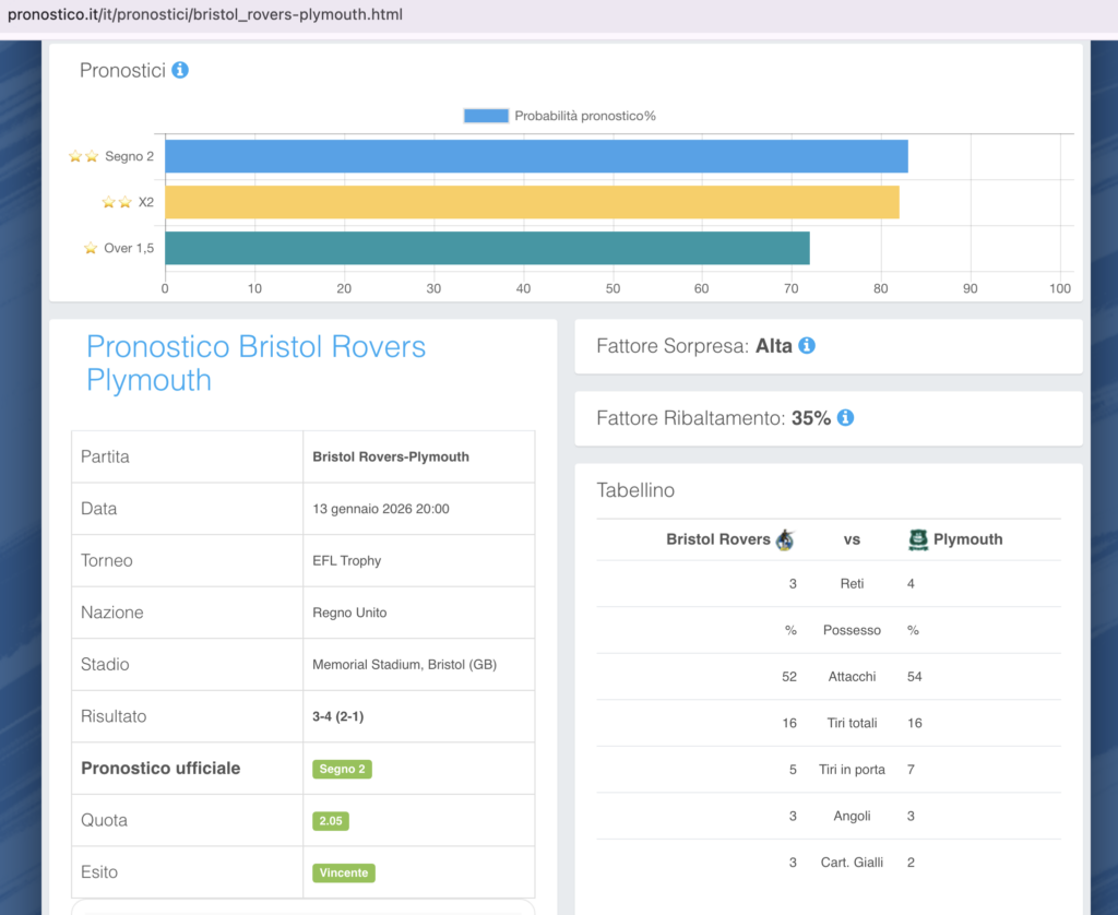 - Pronostico Ufficiale (Blu): Segno 2 all’83% quotato a 2.05