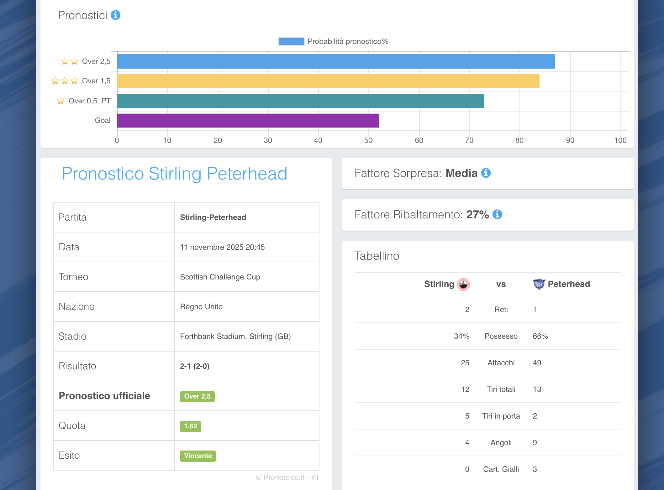 Eppure il modello di Pronostico.it ha “puntato” con maggiore forza sull’Over 2,5 — e infatti il risultato finale è stato 2-1 (Over 2,5 vincente).