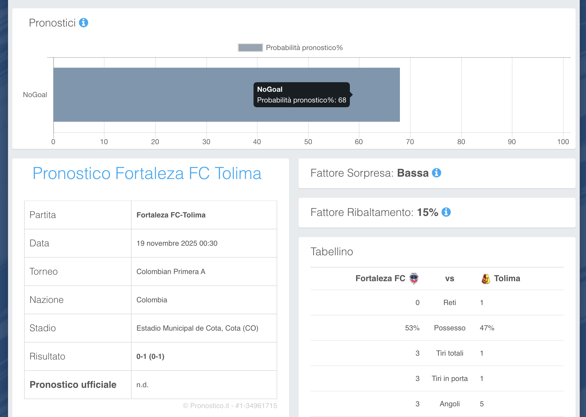 Ho inoltre fatto presente che “In genere al 65% (di probablità) o superiore diventa interessante, altrimenti è debole. In questo caso abbiamo un NoGoal al 68% e l’incontro è terminato 0-1.