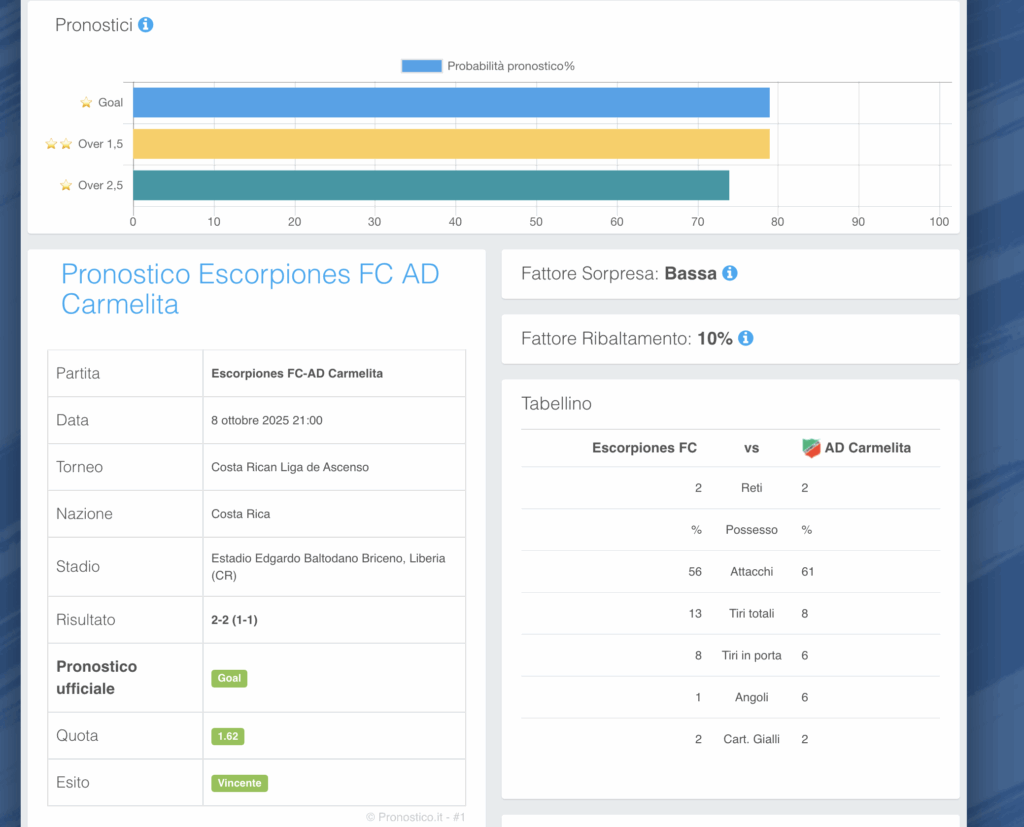 - Pronostico Principale (Blu): Goal, una stella, 79% di probabilità