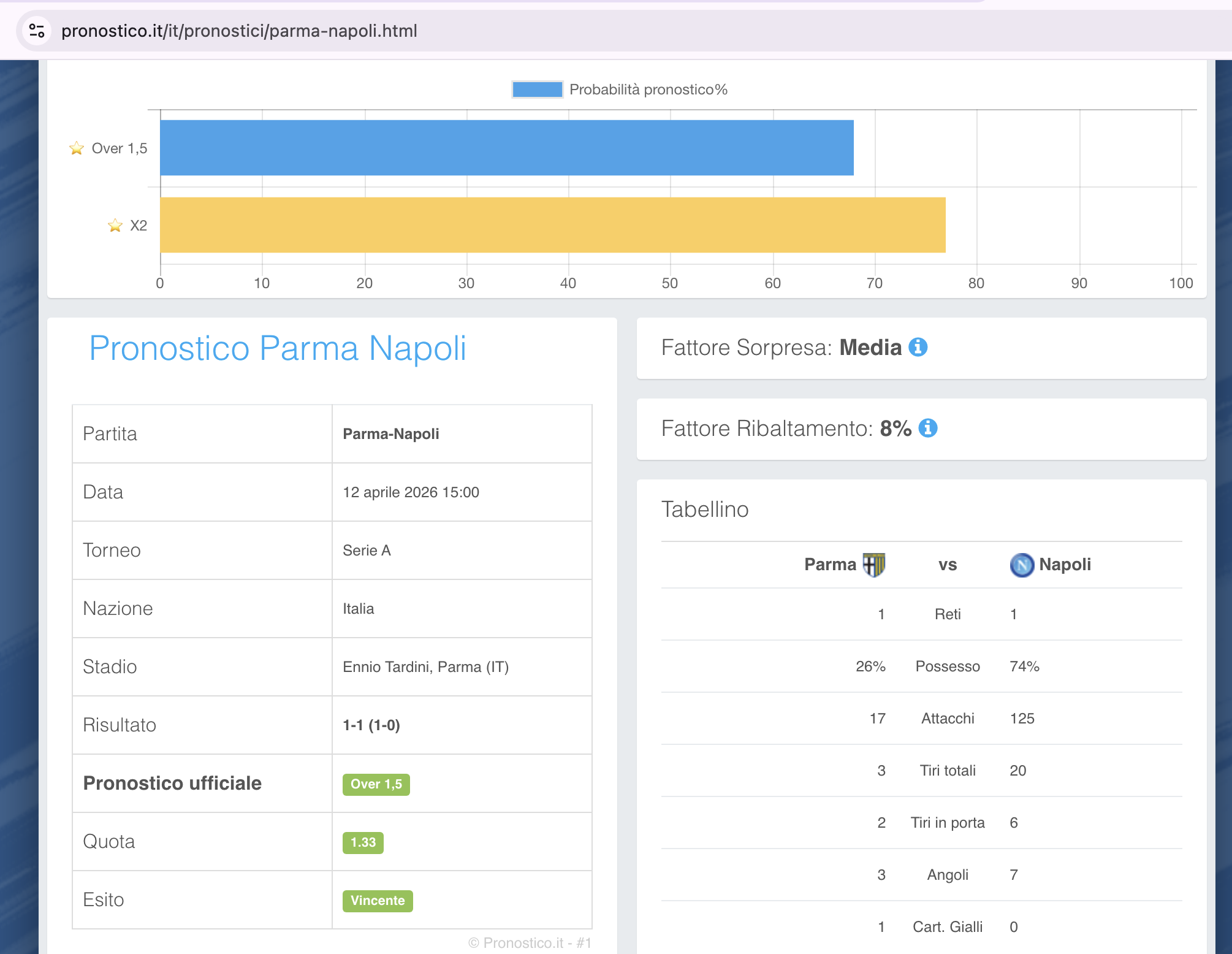 Voglio focalizzare l’attenzione sulla partita Parma-Napoli che molti hanno sbagliato mentre Pronostico.it ha dato due pronostici, entrambi vincenti: